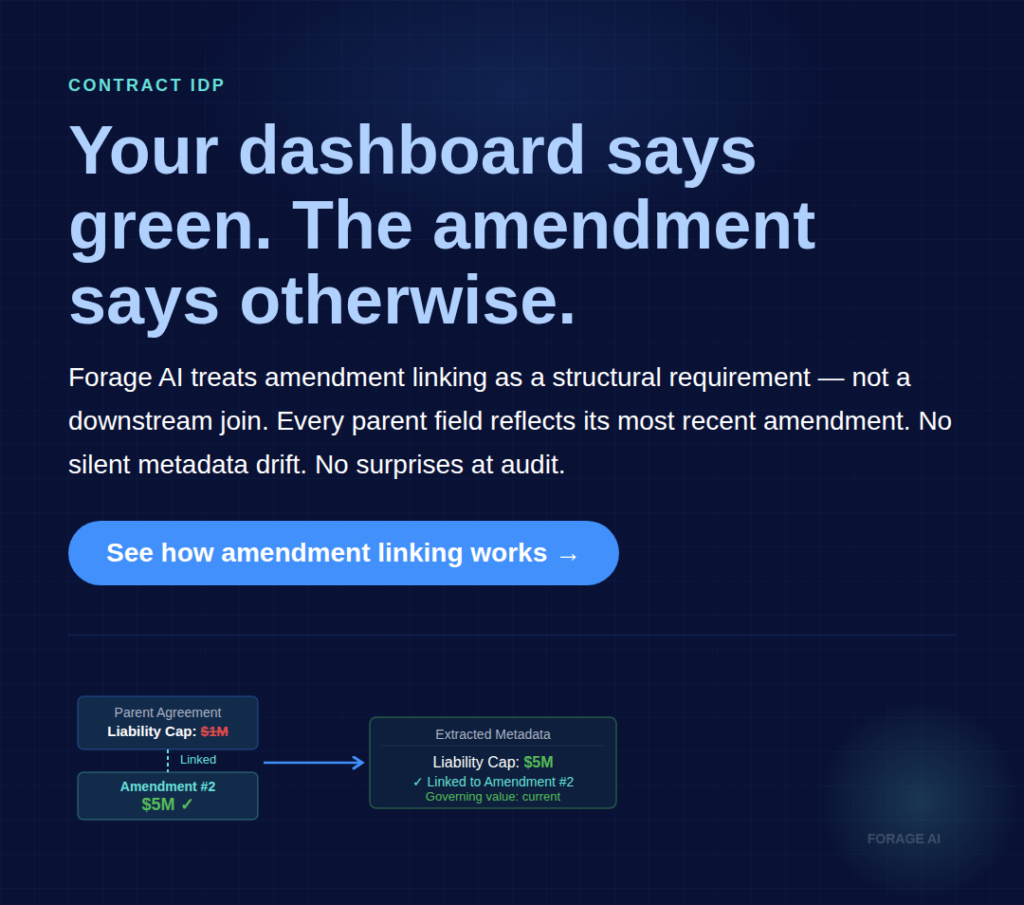 A legal ops team at a mid-market BFSI firm moved 4,000 vendor contracts through a generic IDP pipeline last quarter. Clean extraction reports; 93% field match on the sample audit. Six months later, an intercreditor dispute surfaced a liability cap discrepancy: the extraction had captured the original cap, not the amended one from Amendment #2. The metadata never linked the amendment back to the parent agreement. Extraction accuracy on that field, by every dashboard metric, was 100%.