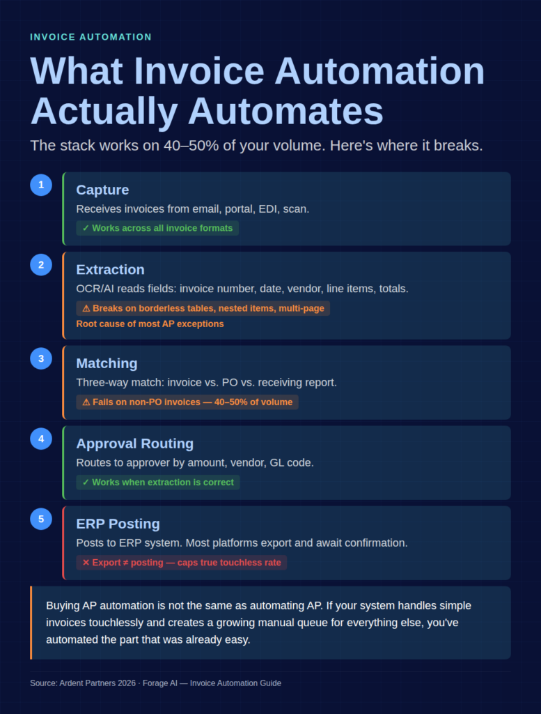Invoice automation covers a stack of capabilities that get marketed as a single thing: capture, extraction, matching, approval routing, and posting. On a clean, PO-backed invoice from a vendor that submits the same PDF template every month, the full stack works. The invoice arrives, OCR or AI extracts the fields, three-way matching validates against the purchase order and receiving report, the approval workflow routes it, and the system posts to your ERP. Touchless.
