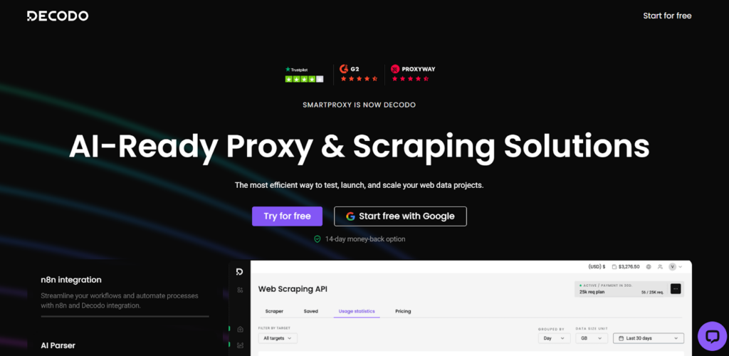 Decodo fits teams moving from small batch extraction to sustained, multi-region pipelines. It balances broad proxy and scraping tooling with a simpler operating model than heavier enterprise stacks, which makes it practical for teams scaling from pilot jobs to steady production workloads. It also fits AI extraction workflows that need stable delivery and flexible routing across different target types.