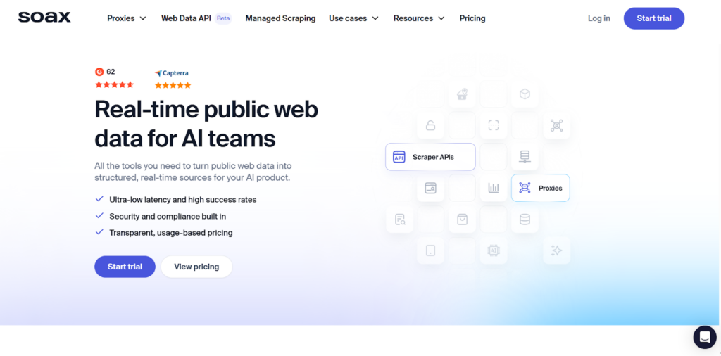 - Proxy format coverage: SOAX offers residential, mobile, and US datacenter proxies, which support different extraction workloads.