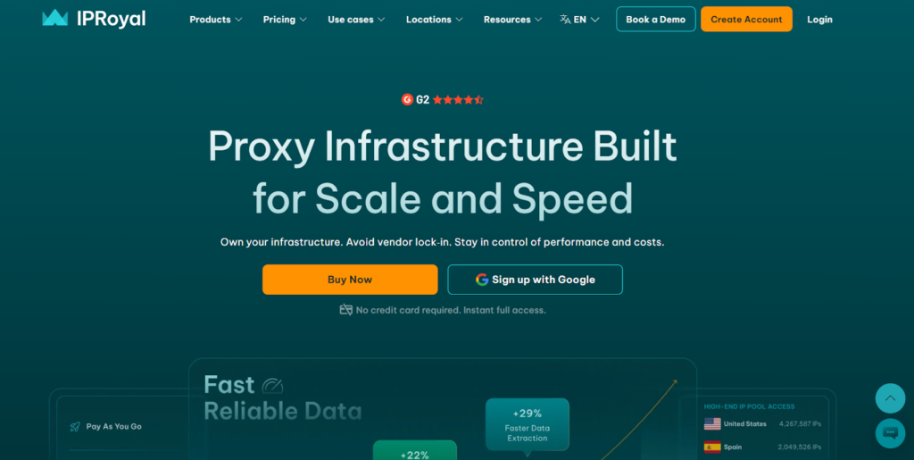 IPRoyal fits teams that want flexible plans and multiple routing options across different pipeline stages. It works well when teams split higher-risk extraction from lower-risk checks and use different proxy formats to control cost, session behavior, and throughput.